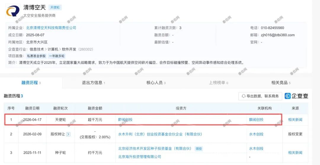 泰伯网讯,4月17日,据企查查,太空安全服务提供商北京清博空天科技有限责任公司(简称“清博空天”)完成由麟阁创投独家投资的破千万元天使轮融资。本轮资金将主要用于空间天地融合观测软硬件体系、太空安全软硬件解决方案体系和在轨服务的软硬件体系的研发。
