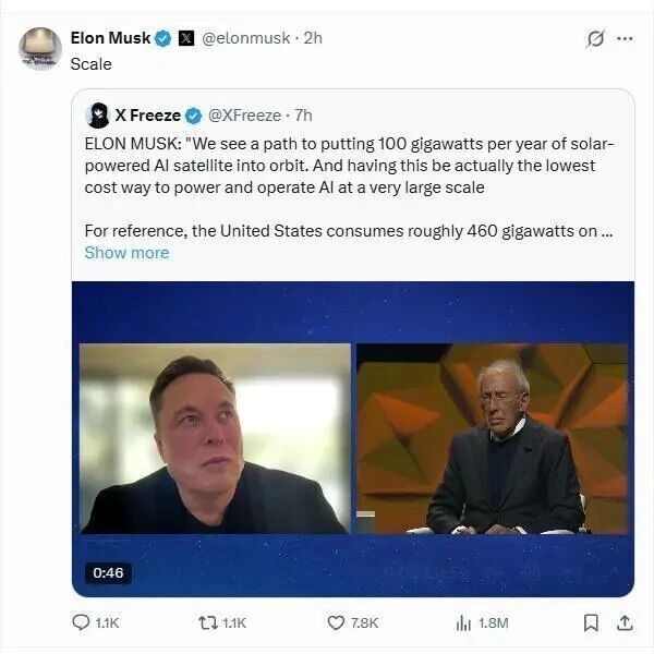 马斯克宣布计划每年发射100吉瓦太阳能AI卫星,同时其"星链"卫星因太阳活动异常大量坠落,2020至2024年已损失583颗。