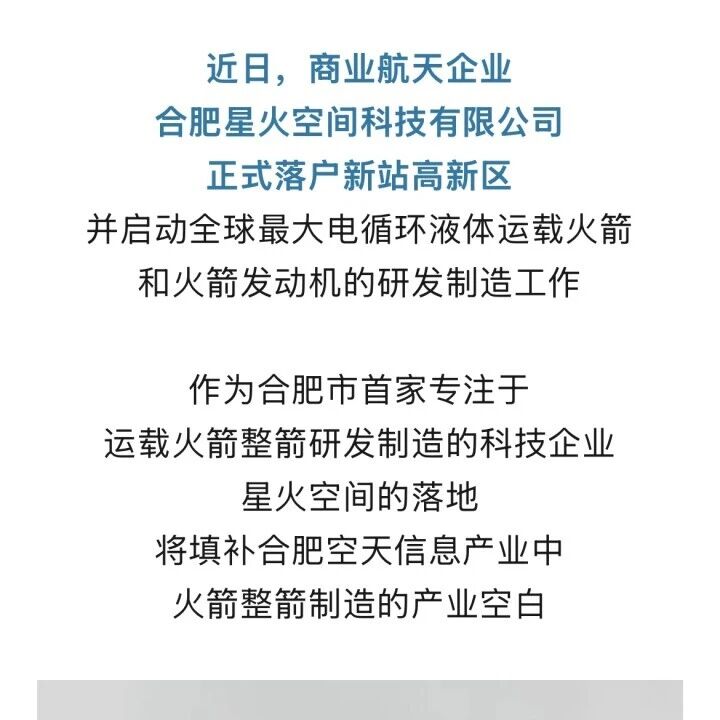 合肥星火空间落户新站高新区,启动全球最大电循环火箭“进化一号”研发,填补当地整箭制造空白,助力空天产业集群打造。